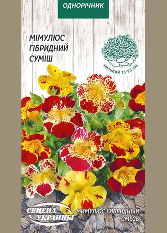 Мімулюс Гібридний (суміш) [0,1г] Мімулюс Гібридний (суміш) [0,1г] Опис: Однорічна рослина з компактними кущами, висотою 15-25 см. Квітки ароматні, діаметром 3-5 см, зібрані в китицеподібні суцвіття, різноманітних строкатих забарвлень. Використовується для декоративного оформлення бордюрів, квітників, балконних ящиків та садових ваз.