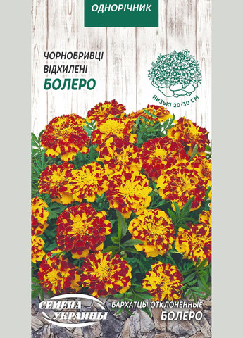 Чорнобривці Відхилені БОЛЕРО Однорічна рослина, висотою 20-30см. Кущі розлогі з відхиленими бічними пагонами. Суцвіття махрові, діаметром 4-7см, коричнево-червоного забарвлення з жовтими плямами на пелюстках. Використовується для оформлення клумб, рабаток та балконних ящиків.