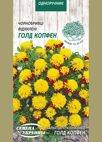 Чорнобривці Відхилені ГОЛД КОПФЕН [0,5г] Однорічна рослина, висотою 15-25см. Кущі розлогі з відхиленими бічними пагонами. Суцвіття махрові, діаметром 4-6см, жовтого забарвлення з коричнево-червоним комірцем. Використовується для оформлення клумб, рабаток та балконних ящиків.