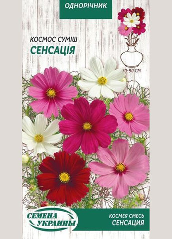Космос СЕНСАЦІЯ (суміш) [0,5г] Однорічна рослина з прямостоячими гіллястими стеблами, висотою 70-90см. Квітки великі, діаметром 7-10см, білого, рожевого, червоного та малинового забарвлення. Використовується для декоративного оформлення клумб, квітників та зрізу в букети.