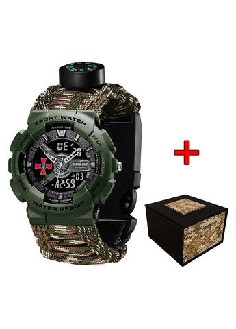 Опис годинника Patriot 005AGSU ЗСУ Представляємо модел Patriot 005AGSU – стильний наручний годинник, створений для активних чоловіків, які цінують надійність та функціональність. З його допомогою ви зможете завжди бути в курсі часу, а також користуватися корисними функціями, такими як будильник, календар, секундомір та другий часовий пояс. Годинник вирізняється спортивним і армейським стилем, має міцний полимерний корпус кольору хаки та каучуковий паракордовий ремінець в камуфляжному забарвленні, що робить його ідеальним для активного життя на природі чи у міських умовах. Водонепроникність до 50 метрів забезпечує безпечність при контакті з водою, а електролюмінесцентна підсвітка надає змогу зчитувати час у темряві. Модель оснащена кварцевим механізмом з круглим циферблатом, на якому чітко відображені години, хвилини, секунди, день тижня, місяць та число. Гарантія на годинник складає 12 місяців, що підтверджує його якість та надійність. Patriot 005AGSU – це не просто годинник, а ваш вірний супутник у пригодах, який підкреслить вашу індивідуальність та смак.
