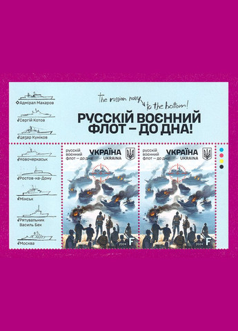2024 марка Русскій воєнний флот - до дна (кут з написом). Рік випуску: 2024 Виставлені на продаж марки України чисті, у відмінному стані, без будь-яких дефектів. Перед відправкою ми надійно упаковуємо марки у щільний картон, щоб унеможливити пошкодження при пересиланні.