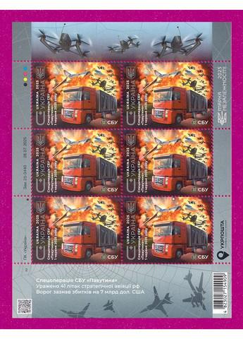 2025 аркуш Спецоперація СБУ Павутина. 1 червня 2025 р. Рік випуску: 2025 Виставлені на продаж марки України чисті, у відмінному стані, без будь-яких дефектів. Перед відправкою ми надійно упаковуємо марки у щільний картон, щоб унеможливити пошкодження при пересиланні.