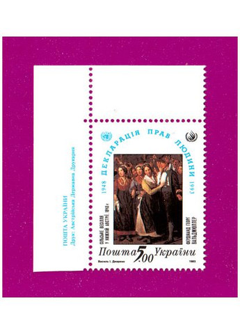 1993 марка 45-річчя Загальної декларації прав людини (кут з написом) УКР. Рік випуску: 1993 Виставлені на продаж марки України чисті, у відмінному стані, без будь-яких дефектів. Перед відправкою ми надійно упаковуємо марки у щільний картон, щоб унеможливити пошкодження при пересиланні.