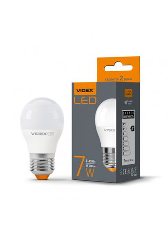 LED лампа VIDEX G45e 7W E27 4100K - високотехнологічне джерело світла. Забезпечує рівний світловий потік і максимальну потужність з першої секунди роботи. Призначена для всіх типів побутових світильників, підходить для загального освітлення приміщень, торгових залів і вітрин, промислових підприємств. Ідеальна для декоративного, місцевого та спрямованого освітлення. Світлодіодні лампи покращують якість штучного освітлення, а також допомагають економити на комунальних платежах. Завдяки мінімальному спотворенню природних кольорів, якісному світла, різноманітності моделей і малому енергоспоживанню - світлодіодні лампи стали головним джерелом світла у всіх сферах людської діяльності. Особливості- Енергоефективність освітлення 90% (A +).- Захист від стрибків напруги в діапазоні від 175 до 250В.- Рівномірне яскраве освітлення без мерехтінь, функція миттєвого включення і відсутність ультрафіолетового випромінювання.- Ефективний тепловідвід через корпус лампи- Величезний ресурс роботи - 40 000 годин (що дорівнює щоденній, 12-ти годинній роботі протягом дев'яти років.) Гарантія 2 роки.- Сумісна з вимикачами з підсвічуванням Енергозберігаючі LED лампочки в 10 разів економніше ламп розжарювання і мають високу світловіддачу (100Лм/Вт). Світловий потік - 700Лм. Комфортне для очей світло, не призводить до втоми і не погіршує емоційний стан, завдяки природній передачі кольорів (>90Ra) і відсутності ультрафіолетового випромінювання. Біле світло (4100К), створює яскраве і комфортне освітлення, наближене до денного. Надійний драйвер, встановлений в лампі, значно збільшує термін служби, прибирає мерехтіння і захищає лампочку від стрибків в електромережі. Лампа світить м'яко, без різких тіней, кут розсіювання - 270°. До складу цієї лампи не входить ртуть та інші шкідливі речовини. Термін придатності до використання необмежений. Не підлягає утилізації у вигляді побутових відходів.