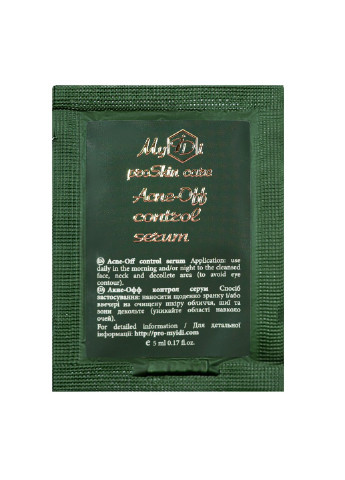 MyIDi Acne-Off Control Serum – косметичний препарат для догляду за проблемною та жирною шкірою обличчя. Це спеціальна формула, яка дає змогу оздоровити епідерміс за короткий період часу. До її складу увійшли азелаїнова та гіалуронова кислоти, екстракти бузини й софори, квіткова вода гамамелісу та ескулін. Особливості MyIDi Acne-Off Control Serum: - азелаїнова кислота забезпечує антибактеріальну й захисну дію; - лікує акне та вугровий висип; - ущільнює верхній шар епідермісу; - поліпшує роботу сальних залоз; - розчиняє бактерії; - екстракт бузини покращує імунітет шкіри, забезпечує захист від інфекційних агентів; - гіалуронова кислота насичує вологою на всіх рівнях шкірного покриву; - квіткова вода гамамелісу заспокоює подразнення й тонізує; - екстракт софори японської забезпечує зменшення синтезу мелатоніну, пігментації; - ескулін – природний УФ-фільтр; - помітний оздоровчий ефект. Спосіб застосування Наносити щодня вранці і/або ввечері на попередньо очищену шкіру обличчя, шиї та зони декольте (уникайте зони навколо очей). Вранці або опісля застосування перед виходом на сонце обов'язково нанесіть крем із SPF більше 20.
