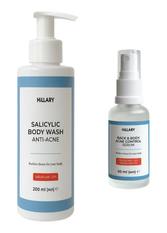 Hillary Salicylic Body Acne Treatment Set – набір для ефективної боротьби з висипаннями та запаленнями на тілі. Очищувальний гель глибоко очищає пори, зменшує висипання та вирівнює текстуру шкіри. Сироватка знижує запалення, покращує зовнішній вигляд шкіри і контролює вироблення себуму. Обидва засоби підходять для щоденного використання і дають помітний результат вже після кількох застосувань. Очищувальний гель, лосьйон-детокс та сироватка працюють в комплексі, щоб глибоко очистити пори, зменшити запалення та покращити текстуру шкіри. Саліцилова кислота проникає вглиб шкіри, контролюючи вироблення себуму і допомагаючи в боротьбі з акне, залишаючи шкіру чистою, зволоженою та здоровою. Завдяки активним компонентам, гель для тіла з саліциловою кислотою ефективно очищує пори, зменшує видимість висипань і вирівнює текстуру шкіри, роблячи її гладкою та свіжою. Гель ретельно очищує шкіру, м’яко видаляючи забруднення та надлишки жиру, не викликаючи подразнень. Це забезпечує чистоту, оновлення та доглянуту шкіру без сухості та стягнутості. Гель підходить для щоденного використання, зокрема для жирної, комбінованої та проблемної шкіри. Завдяки саліциловій кислоті, засіб візуально зменшує прояви висипань та вирівнює текстуру шкіри, залишаючи її гладенькою та свіжою. Ніацинамід у складі контролює жирність шкіри, зменшує почервоніння та сприяє відновленню захисного бар'єру. Вітамін Е забезпечує антиоксидантний захист, живить шкіру та пом’якшує її структуру. Сироватка для шкіри, схильної до акне, з саліциловою кислотою — це дієвий засіб для очищення, боротьби з висипаннями та запаленнями на спині та тілі. Завдяки саліциловій кислоті (2%) і ніацинаміду вона не тільки очищує пори, але й покращує загальний вигляд шкіри, роблячи її гладкою та здоровою. Результати досліджень показали, що використання сироватки Hillary Back & Body Acne Control Serum допомагає зменшити висипання на 67%, покращити текстуру шкіри на 74% та знизити запалення на 78%. Завдяки саліциловій кислоті, сироватка ефективно контролює вироблення себуму та сприяє покращенню загального вигляду шкіри на 81%. Завдяки своїй легкій текстурі, вона швидко вбирається, не залишаючи липкості і проникає глибоко в пори, очищаючи їх від забруднень та надлишку себуму. Вже після декількох застосувань, шкіра стає більш рівною, а запалення і почервоніння зменшуються. До набору входять: - Очищувальний гель для тіла з саліциловою кислотою Hillary Anti-Acne Salicylic Body Wash, 200 мл - Сироватка для проблемної шкіри з саліциловою кислотою Hillary Back & Body Acne Control Serum, 50 мл Спосіб використання 1. Масажними рухами нанести гель на вологу шкіру тіла, спінити, м’яко втирати в шкіру круговими рухами. Змити великою кількістю води. Підходить для щоденного використання. 2. Розпилити сироватку на чисту шкіру тіла і залишити до повного поглинання. Підходить для всіх типів шкіри. Застереження Можлива індивідуальна чутливість до компонентів продукту. Перед використанням рекомендовано зробити тест на алергічну реакцію на невеликій ділянці шкіри. Уникати контакту з очима. У разі потрапляння в очі негайно промити їх водою.