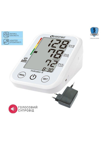 Опис: Тонометр з голосовим супроводом Paramed Indicator-X - це пристрій для вимірювання тиску, оснащений додатковими функціями, які роблять процес простим і зручним, це автоматичний тонометр з роз'ємом Type-C і мережевим адаптером в комплекті. Тонометр Indicator-X простий у використанні, виводить результати виміру на екран та паралельно їх озвучує (у тому числі українською мовою). Функція голосового супроводу в тонометрі – це незамінний параметр для людей з поганим зором або повною його відсутністю. Користувачеві достатньо надіти манжету і натиснути кнопку включення, щоб користуватися приладом самостійно. Indicator-X оснащений великим екраном і збільшеною манжетою розміру 22-40см, який підійде практично для всіх користувачів. Каркасна манжета Paramed 22-40 см розроблена з урахуванням анатомічної особливості людської руки. Немає кільця, але завдяки своїй каркасній формі полегшує одягання манжети на руку. А також забезпечує рівномірний розподіл тиску на всій ділянці артерії, що знаходиться під манжетою, що є запорукою отримання точного результату і зводить до мінімуму болючі відчуття від стискання руки. Автоматичний тонометр Paramed Indicatort-X - прилад з розширеним функціоналом, який допоможе легко і швидко виміряти тиск. Серед переваг приладу - робота за технологією Fast Logic, яка забезпечує високу точність результатів, навіть за слабкого серцебиття. У більшості випадків гіпертонічний криз настає через те, що хворий не встигає вчасно вжити заходів. Перші симптоми нездужання – головний біль, утруднене дихання, шум у вухах, запаморочення – все це сигнал для покупки тонометра. Самоконтроль у домашніх умовах дає можливість попередити це та інші небезпечні стани та можливі ускладнення через ненормальний тиск. Тонометри бренду Парамед оснащені унікальною функцією донакачування, розробленою виробником. Функція корисна людям, яким властиво дуже високий тиск, що значно перевищує норму. Якщо ваш тонометр погано працює на високих значеннях, слід розглянути модель Paramed. Більшість тонометрів інших брендів нагнітають повітря до позначки 160-170. Але деяким гіпертонікам властивий тиск 180-200, а критичні моменти піднімається і вище. Якщо ви відчуваєте, що апарат зупинився зарано, натисніть на корпусі кнопку “М”. Після цього тонометр докачає повітря ще 20 мм рт. ст. Особливості автоматичного тонометра на плече Paramed Indicator-X з адаптером Type-C: ¤ Є індикатор аритмії - фіксація порушень серцевого ритму з сигналом у відповідь на дисплеї; ¤ Є можливість підключення через роз'єм Type-C (адаптер входить у комплект) для роботи від адаптера, ноутбука або повербанка. ¤ І має відмінні ергономічні показники, тому підійде для користувачів похилого віку; ¤ Функція донакачування манжети для надвисоких показників (натисканням кнопки нагнітає повітря ще на 20 мм рт. ст.); ¤ Індикатор руху – якщо людина рухається під час вимірювання, що може призвести до неточних результатів, попереджає про те, що вам потрібно повернутися до стану спокою; ¤ Голосовий супровід - прилад озвучує результати виміру; ¤ Великий рідкокристалічний дисплей ¤ Пам'ять по 120 вимірювань для кожного з двох користувачів. ¤ Клавіші із захистом від попадання пилу - продовжує термін служби приладу; ¤ Функція усередненого значення дозволяє точно відстежити зміни артеріального тиску за весь день; ¤ Прилад розраховує середній показник арте