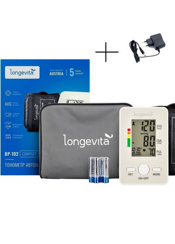 Опис: Модель тонометра BP-102 Longevita зі збільшеною плечовою манжетою - точний вимірювач артеріального тиску і пульсу з пам'яттю для двох користувачів, визначенням аритмії і обчисленням середнього результату. Сучасна модель, ергономічної форми з великим екраном, де відображаються чіткі символи: тиск, пульс, дата і час. Звуковий сигнал сповістить про початок, а також кінець вимірювання. Якщо під час вимірювання приладом буде діагностовано аритмію, то на екрані з'явиться відповідний символ, при цьому на достовірності показань це не позначиться. BP-102 Longevita запам'ятовує 120 останніх показань тиску і пульсу по 60 для кожного користувача, при цьому фіксується дата і час процедури. За бажання можна дізнатися середній результат, виходячи з показань, що зберігаються в пам'яті - обчислюється тонометром автоматично. Манжета на плече стандартного розміру 22-32 см, що дає змогу її використовувати для всіх членів сім'ї - з худою і повною рукою. З правого боку дисплея розташована кольорова шкала відповідності тиску нормативам ВООЗ, за якою самостійно можна зрозуміти, чи перебуває ваш показник АТ у зоні ризику. Прилад працює від батарейок або через адаптер (входить в комплект). Особливості автоматичного тонометра на плече LONGEVITA BP-102: ¤ Індикатор аритмії сигналізує, якщо пристрій зафіксує порушення серцевого ритму ¤ Пам'ять приладу фіксує 120 значень АТ і пульсу ¤ Запам'ятовування показань 2 осіб - 60 для кожного ¤ Фіксація результатів у пам'яті з датою, часом ¤ Розрахунок середнього показника тиску ¤ Шкала відповідності нормативам ВООЗ ¤ Звуковий сигнал, що сигналізує про початок і закінчення вимірювання Технічні характеристики тонометра автоматичного на плече LONGEVITA BP-102: • Метод вимірювання: осцилометричний • Алгоритм вимірювання: Inflation Measuring System (вимірювання під час нагнітання повітря в манжету) • Дисплей: великий цифровий РК дисплей із підсвічуванням • Нагнітання повітря в манжету: автоматичне • Розмір манжети: стандартна LUX манжета (22-32см) • Індикація аритмії: так • Обчислення середнього тиску: так • Діапазон вимірювання пульсу, ударів на хв: 30-180 • Точність вимірювання пульсу: ±5 % • Точність вимірювання АТ: ± 3 мм рт. ст. • Пам'ять, комірок: 2х60 • Дата і час: так • Джерело живлення: 4 елементи живлення типу "ААА" і мережа (адаптер 6V входить до комплектації) • Маса: 405 • Розміри: 13,9 х 8,8 х 4,5cм Комплектація: тонометр, стандартна LUX манжета (22-32см), мережевий адаптер 6V, інструкція з експлуатації російською мовою, сумка для зберігання і перевезення тонометра і комплектуючих, гарантійний талон. Виробник: Longevita (Китай) Країна реєстрації бренду: Австрія Гарантія: 5 років