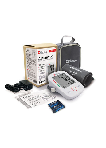 Тонометр автоматичний з адаптером ProMedica Expert, апарат для вимірювання тиску, гарантія 10 років: Автоматичний електронний тонометр Promedica Expert з універсальною манжетою 22-42 см призначений для використання в домашніх умовах або медпрацівниками для вимірювання артеріального тиску та пульсу. Тонометр Expert із великими цифрами на дисплеї. Прилад оснащений вбудованим компресором, який автоматично створює тиск у манжеті та дозволяє використовувати прилад без сторонньої допомоги. У тонометрі є функція визначення аритмії, а також пам'ять 30 останніх вимірювань АТ. Особливості: Об'єм пам'яті розрахований на збереження 30 результатів вимірювання для 2-х користувачів; Відображення класифікації артеріального тиску відповідно до вимог ВООЗ; Функція визначення аритмії; Збільшена плечова манжета 22-42 см підійде більшості користувачів; У комплекті мережевий адаптер; Зберігає середнє значення 3-х останніх вимірювань для більш точного визначення рівня артеріального тиску; Автоматично вимикається протягом 1 хвилини; Цифровий рідкокристалічний дисплей з великими символами буде зручним для людей з поганим зором. Технічні характеристики: Тип дисплея - рідкокристалічний LCD дисплей, розмір 74х68мм; Джерело живлення - 4 елементи AAA (мініпальчикові батарейки) та мережевий адаптер; Розмір манжети - 22-42 см; Пам'ять - 30 х 2 вимірів; Умови експлуатації: температура повітря від +10°C до +40°С при відносній вологості від 30% до 85%; Температура зберігання від -20°C до +60°C при відносній вологості від 10% до 95%; Діапазон вимірювання тиску: 0-299 мм рт.ст., частоти пульсу: 40-180 уд/хв.; Гранична похибка вимірювання тиск: ±3 мм рт.ст., частота пульсу: ±5%; Одиниця вимірювання - мм рт. ст.; Технологія IHD – передова технологія визначення аритмії на ранній стадії; AVG технологія, що визначає середнє значення 3-х останніх вимірювань; FUZZY LOGIC технологія – автоматично визначає ступінь накачування манжети, запобігає її перекачування; Індикатор "Світлофор", класифікація вимірювання за стандартами ВООЗ; Звуковий сигнал; Інформація про помилку; Відображення дати\часу. Комплектація: електронний блок; манжета; мережевий адаптер; сумка-футляр для дбайливого зберігання; 4 батареї типу ААА; гарантійний талон та інструкція. Гарантійний термін – 10 років (на прилад)