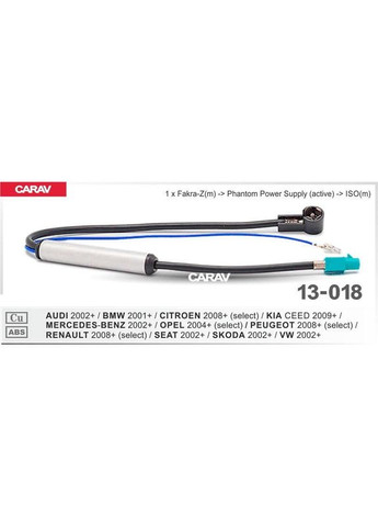 Антенний перехідник для Audi, Skoda, Seat, Volkswagen, Mercedes, BMW, KIA, Opel, Citroen, Peugeot, Renault серії Carav 13-018 KIA Mercedes Nissan Alfa Romeo Saab Ceed 2010-2012 Sprinter 2018-2021 Primastar 2006-2010 Giulietta 2010-2020 9.3 2005-2014 Venga 2009-2019 Vito (W447) 2014-2021 NV400 2010-2019 MiTo 2008-2018 9.5 2005-2010 Audi Renault Fiat Seat Skoda A1 2010-2019 Captur 2013-2019 500 2016-2020 Alhambra 2010-2020 Citigo 2011-2020 A3 2003-2013 Clio 2009-2019 500L 2012-2020 Altea 2004-2015 Fabia 2007-2014 A4 2000-2009 Master 2010-2019 500X 2015-2020 Exeo 2008-2013 Octavia 2013-2019 A5 2007-2010 Megane 2009-2019 Doblo 2015-2020 Ibiza 2008-2020 Rapid 2012-2020 R8 2007-2015 Scenic 2009-2016 Ducato 2015-2020 Leon 2005-2020 Roomster 2006-2015 Q5 2008-2016 Trafic 2006-2020 Panda 2012-2020 Mii 2011-2020 Superb 2008-2015 TT 2006-2014 Twingo 2009-2019 Scudo 2007-2016 Toledo 2005-2016 Yeti 2009-2014 Wind 2010-2013 Talento 2016-2020 Citroen Opel Volkswagen Peugeot Ford Berlingo II 2008-2018 Adam 2013-2019 Amarok 2010-2016 207 2006-2013 B-Max 2013-2017 C1 (1G) 2012-2014 Agila 2004-2007 Beetle 2011-2019 207CC 2007-2015 C-Max (DXA) 2011-2019 C2 2005-2010 Antara 2006-2010 Caddy 2003-2020 307 2005-2009 EcoSport 2013-2017 C3 2005-2016 Astra 2004-2020 серії Caravelle 2003-2015 308 2009-2013 Fiesta (JA8) 2012-2017 C4 2004 -2010 Combo 2004-2011 CC 2010-2014 407 2005-2011 Focus (DYB) 2011-2018 C5 2004-2008 Corsa 2004-2020 Crafter 2017-2020 807 2008-2014 Kuga (13) 2013-2019 C6 2004-2012 Insignia 2008-2013 EOS 2006-2012 Boxer 2015-2020 Ranger 2012-2020 C8 2008-2014 Karl 2015-2019 Fox 2005-2015 Expert 2007 -2020 Tourneo Connect 2013-2018 Dispatch 2016-2020 Meriva 2006-2017 Golf 2003-2020 Traveller 2016-2020 Transit Connect 2013-2018 DS3 2010-2016 Mokka 2012-2016 Jetta 2005-2020 Partner 2008-2015 Transit Custom (FCC) 2013-2018 DS4 2011-2015 Movano 2016-2019 Multivan 2003-2015 RCZ 2010-2013 Tourneo Custom 2012-2018 Jumpy 2007-2020 Signum 2005-2008 Passat 2005-2014 Chevrolet Transit V363 2014-2018 Jumper 2015-2020 Tigra Twin Top 2004-2009 Polo 2005-2020 Equinox 2009-2016 Spacetourer 2016-2020 Vectra C 2004-2008 Phaeton 2007-2010 Vivaro 2006-2019 Scirocco 2008-2014 Zafira B 2005-2015 Sharan 2010-2020 Zafira Tourer 2011-2016 T5 2003-2015 T6 2015-2019 Tiguan 2007-2020 Touran 2003-2015 Touareg 2003-2010 UP! 2011-2020 Перехідники живлення призначені для встановлення нестандартної магнітоли у сучасний автомобіль. Вони забезпечують зв'язок пристрою з електронними вузлами автомобіля, дозволяючи повноцінно використовувати весь його функціонал: Як вибрати перехідник живлення? Щоб правильно підібрати перехідник живлення з адаптером CAN BUS, необхідно знати такі параметри автомобіля. марку та модель авто; рік випуску; комплектацію; бажано — місце випуску машини (американські, азіатські та європейські версії можуть мати однакову назву, але відрізнятися конструкцією). Важливо вибирати якісний аксесуар. Проведення – важливий компонент сучасного авто. Економія на ній може обернутися неможливістю використання всіх функцій магнітоли, появою помилок у блоках керування автомобіля та навіть поломкою важливих компонентів машини.