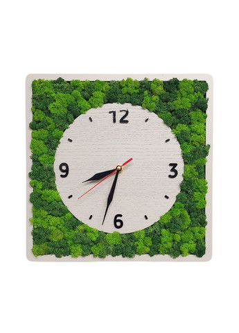 Цей дерев'яний годинник з мохом - прекрасне доповнення до будь-якого інтер'єру. Він напевно додасть вашому простору відчуття природності та органічності. Усі годинники виготовляються з натуральних матеріалів, таких як дерево і мох. Кожен виріб виготовляється вручну на замовлення, що робить його на 100% унікальним. Характеристики: - Матеріали основи: дерево ясен, МДФ - Матеріал покриття: поліуретановий ґрунт, акрилова фарба, лляна олія для дерева - Годинниковий механізм посилений JH 1668SW-17 - Розміри: 40х40х4 см - Колір: білий - Колір циферблата: чорний - Зі стабілізованим мохом - Тип: настінний