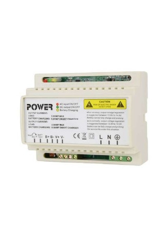 Безперебійний блок живлення імпульсний одноканальний для кріплення на DIN-рейку. Живлення AC100-240V/50-60Hz клемник, вихідна напруга DC12...14V/3A, клемник. Захист від перенапруги, КЗ, перевантаження струмом, а також захист заряду/розряду акумулятора. Корпус пластиковий. Розміри: 107 х 87 х 63 мм. Тип пристрою: блок безперервного живлення Тип блоку живлення: імпульсний Вхідна напруга, В: 100–240 Вихідна напруга, В: 12-14 Вихідний струм, А: 3 Кількість каналів навантаження: 1 Підключення вхід: клемник Підключення вихід: клемник Індикація: світлова Гарантійний термін: 12 місяців Матеріал: пластик Робоча температура, °C: -10 ~ +45 Вид виконання: з кріпленням на DIN-рейку Розміри, мм: 107 х 87 х 63
