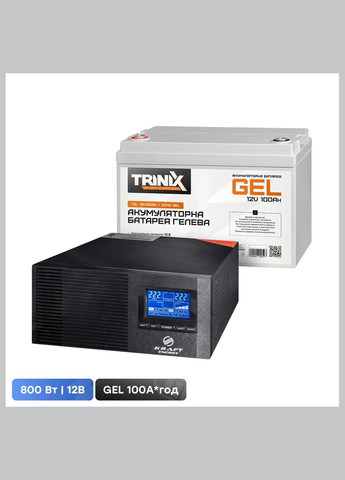Комплект резервного живлення: інвертор з функцією ДБЖ 800 Вт Kraft KRF-AVR1000VA/800W-12V + акумуляторна батарея 12В 100Аг Trinix GEL. Інвертор з функцією ДБЖ з потужністю 1000 ВА/800 Вт, з вбудованим зарядним пристроєм та правильною синусоїдою на виході; струм заряду 10/20 А; напруга акумуляторної батареї 12 В; вхідна напруга 145-270 В (режим ДБЖ), 100-290 В (режим інвертора); вхідна частота 45-65 Гц; вихідна напруга в AC-режимі 203-238±5 В (режим ДБЖ), 150-255 В (режим інвертора), в режимі АКБ 220 В; вихідна частота 50 Гц±0.5 Гц; час перемикання на АКБ 10 мс; підтримка заряду АКБ типу AGM/GEL/LiFePO4; ККД 80%; захист від розряду та перезаряду АКБ, захист від перевантаження та температурний захист; режими роботи: пріоритет мережі / пріоритет АКБ; можливість вибору режиму ДБЖ / інвертор; робоча температура 0°C~+40°C; розміри 290 / 257 / 123 мм; вага брутто 11.6 кг. Акумуляторна батарея гелева (GEL); ємність 100 Аг, вихідна напруга 12 В; тип клем T14; розміри 230 / 330 / 180 мм; вага 28±3% кг