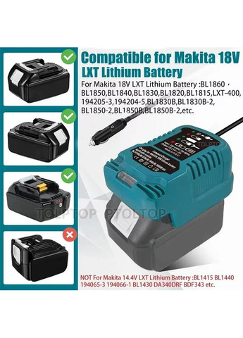 Портативний зарядний пристрій для Makita 18V 20V літій-іонний акумулятор від автомобільного прикурювача зарядний пристрій зарядка Stromo, Makita, Procraft, Revolt, Grand, Profi tec Onevan Patuopro та ін Автомобільна зарядка для акумулятора Makita, Procraft, Revolt, Grand, Profi tec Onevan Patuopro та ін Для Літієва батарея Makita 18 В:BL1815 BL1830 BL1840 BL1845 BL1840B BL1850B BL1860B B194205-3194230-4LXT400 CF201 BCF201Z BCL180 BCL180F BCL180W BCL180Z BCL180 ZW BCL182 BCL182Z BCS 550 BCS550F BCS55ORFE BCS550Z BDA350 BDA350FBDA350RFE BDA350Z BDA351 BDA351RFE BDA351Z BDF450 BDF451 BDF451RFE * Compatible for Makita 18V Battery BL1850B, BL1860B, BL1840B, BL1830B, BL1820B, BL1815 etc LXT Lithium Battery (NOTE: Batteries not included). * Compatible for Dewalt 18V-20V and 60V MAX Lithium ion battery, such as DCB612, DCB609-2, DCB609, DCB606, DCB606-2, DCB208, DCB206, DCB206-2, DCB204, DCB203, DCB203-2, DCB204-2, DCB201, DCB200, DCB200-2, DCB230, DCB240, DCB240-2 etc(NOTE: Batteries not included). * Compatible for Milwaukee 18V Battery 48-11-1852, 48-11-1811, 48-11-1815, 48-11-1820, 48-11-1822, 48-11-1828, 48-11-1840, 48-11-1841, 48-11-1850 etc(NOTE: Batteries not included). Portable Charger For Makitas/Milwaukee/Dewalt 18V 20V Lithium-Ion Battery Replace Charger Car Cigarette Lighter Plug