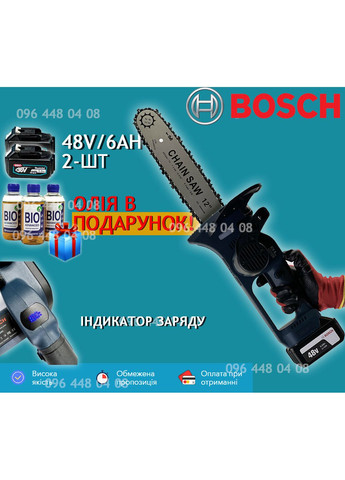 Акумуляторна ланцюгова пила Bosch UniversalChain 48 (48V 6.0 Ah) Шина 30см Ланцюг 3/8" АКБ пила Бош Високопродуктивна ланцюгова пила Bosch UniversalChain працює на Li-Ion ( 48 V 6.0 Ah) акумулятор, забезпечує абсолютну свободу від електрики та мережевих кабелів під час розпилювання гілок, дров, колод, дощок, стовбурів дерев. Пила зі швидкістю ланцюга 6 м/с однаково ефективно ріже деревину вздовж і поперек волокон. ОСОБЛИВОСТІ: Легка, компактна, чудово збалансована, ергономічна конструкція. Апарат видає мало шуму та може застосовуватися в приміщеннях. Зручні задня та додаткова ручка з ізольованою поверхнею. Автоматичне змащення ланцюга. Практичний, ударостійкий корпус. Пила ланцюгова Bosch UniversalChain 48 приводиться в дію Li-Ion 48 В акумулятором 2 шт. у комплекті. Пила із шиною 30 см. Сталевий ланцюг з приводними ланками завтовшки 1,3 мм. Оливний бак об'ємом 80 мл. Автоматичне змащення ланцюга. Зубчастий упор дає змогу надійно зафіксувати інструмент на заготівці, щоб виключити його зміщення під час роботи. Водночас не ушкоджує деревину. Система Quick Stop миттєво зупиняє інструмент під час заклинювання ланцюга в матеріалі, водночас максимально запобігає зворотному удару. Захисний щиток руки. ХАРАКТЕРИСТИКИ: Тип: - побутова Номінальна напруга: - 48В Ємність АКБ: - 6.0 А·год Довжина шини — 30 см Крок ланцюга — 3/8" Швидкість обертання ланцюга: - 6 м/сек Кількість обертів: - 8500 об/хв Об'єм оливного бака: - 80 мл Тип оливного насоса: - автоматичний Гальмо ланцюга: - є Час спрацьовування гальма ланцюга: - 0.21 сек Час заряджання акумулятора: - 60 хв Вага: - 4,2 кг КОМПЛЕКТАЦІЯ: Пила Bosch UniversalChain 48 — 1 шт. Шина 30 см — 1 шт. Ланцюг — 1 шт. АКБ ( 48 V, 6 Ah) — 2 шт. Зарядний пристрій — 1 шт. Інструкція Гарантійний талон (12 місяців)