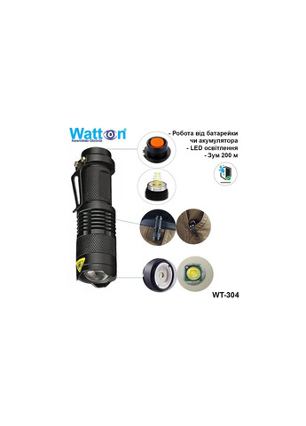 U0747361 Тип: ручний, тактичний Джерело світла: Cree XR-E Q5 Дальність світлового потоку: 200 м Яскравість: 300 люмен Захист: вологонепроникний, ударостійкий, пилевідштовхувальні Елементи живлення: AA, Li-Ion, 14500 Кількість елементів живлення, що встановлюються: 1 Матеріал корпусу: алюміній Кількість режимів яскравості: 3 Режими: максимальний, середній, мінімальний Колір чорний Виробник: Watton Модель: WT-304 Гарантія, міс: 1 Штрихкод: 2000000292731 Бренд: Watton Ліхтар ручний акумуляторний - це ультраяскравий і дуже компактний ліхтар. Компанія – виробник доклала максимум зусиль, щоб зробити цей гаджет високоякісним та практичним. До того ж його мізерна вага (65,6 г!) і малі розміри дуже актуальні в сучасному світі, де кожен міліметр відіграє важливу роль. Це найменший ліхтарик на світлодіоді CREE Q5. Для моделі характерні такі габарити: довжина – 9,2 см; діаметр голівки – 2,6 см; діаметр задньої кнопки – 2,1 см; діаметр корпусу – 2,0 см Розробники впровадили надпотужний світлодіод Q5 провідної американської фірми Cree. Приблизно 10 років безперервної експлуатації! І це тому, що ресурс світлодіоду складає 100 000 годин. Потужність світлового потоку 500 люменів не залишить Вас байдужими до цього ліхтарика. Дальність світіння – 200 метрів. І це ще не все, що здатний наш мініатюрний помічник! Zoom (масштабування) від 1х до 2000х також є в наявності ліхтаря. Масштабування робиться легким рухом руки. Фокусування променя здійснюється за допомогою висування головної частини ліхтаря. Фокусувальна лінза дозволяє змінювати кут розсіювання світла від широкої плями до вузькоспрямованого променя. Живиться ліхтар від літієво-іонного акумулятора 14500 (іде в комплекті) або від однієї батареї типу АА