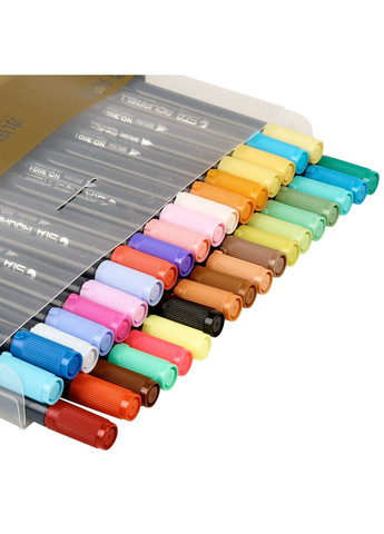 Акварельні маркери - це новий інноваційний продукт, який об'єднав у собі компактність маркера та ефектність акварельної фарби. Акварельні маркери наповнені пігментованим чорнилом на водній основі (пігмент, розчинений у воді). Пігментоване чорнило, що використовується в аквамаркерах, має безліч переваг. По-перше, вони володіють яскравим, насиченим світлостійким кольором (колір не тьмяніє при світловому впливі протягом довгого часу). По-друге, пігментоване чорнило не містить кислот і виробляється на основі натуральних компонентів. Для цих маркерів ідеально підходить акварельний папір, на якому ви зможете сповна розкрити їхній потенціал. Маркери мають два наконечники: гнучкий нейлоновий пензлик для м'якого зафарбовування і тонке перо для промальовування деталей. Такі маркери ідеальні для дитячої творчості, оскільки допомагають утримувати робоче місце юного художника в порядку. Крім того, це чудове рішення для любителів вуличних замальовок і пленерів: заощаджують місце, можуть використовуватися з блендером або водним пензликом, що значно полегшує вагу та об'єм мистецького приладдя і допомагає уникнути проливання води. Маркери краще зберігати в горизонтальному положенні для рівномірного розподілу фарби і продовження терміну служби. Товщина маркера залежить від кута нахилу пишучого вузла. Якщо писати перпендикулярно до друкованої поверхні - товщина 2 мм, якщо під нахилом - 3 мм.