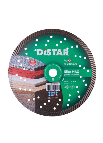 Алмазний круг Distar Elite Max створено спеціально для професійного оброблення гранітних поверхонь. Завдяки своїй унікальній структурі та наявності тепловідвідних отворів по всьому диску забезпечує максимально м'яку та комфортну роботу. Чудово підходить для різання всіх різновидів граніту. На ринку представлений у варіанті 232 міліметри та з алмазним шаром заввишки 12 мм. Застосовується на кутошліфувальних машинах (болгарках) із посадковим місцем 22.23 мм. Забезпечує високу швидкість різання до 1.6 метра на хвилину, за ресурсу роботи 225 заглиб. м. на граніті 5-ї категорії твердості на глибину 30 мм. Позиціює себе як найзбалансованіший інструмент для оброблення гранітних поверхонь. Для оброблення чорного граніту типу Габро рекомендуємо використовувати спеціально розроблений для цього типу каменю диск алмазний Gabbro.