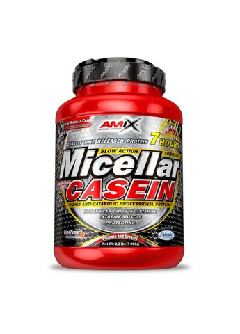 Amix Micellar Casein – це високоякісний білковий продукт, що містить міцелярний казеїн, отриманий методом мікро- та ультрафільтрації без використання кислот та термічної обробки. Завдяки цьому зберігається натуральна структура білка, що забезпечує повільне вивільнення амінокислот протягом тривалого часу. Склад 1 порції - 44 г: Усього жирів - 0,9 г Насичені жири – 0,6 г Усього вуглеводів - 2,5 г Сахара - 2 г Білок – 35,4 г Сіль – 0,4 г DigeZyme ® Мультиферментний комплекс – 66 мг Кальцій – 902 мг Середній амінокислотний профіль на 100 г чистого білка: Аланін - 3300 мг Лізин – 8400 мг Аргінін – 3700 мг Метіонін – 2800 мг L-аспарагінова кислота – 7800 мг Фенілаланін – 4900 мг Цистеїн – 1200 мг Пролін - 9800 мг Глутамін – 21600 мг Серін - 5600 мг Гліцин – 1900 мг Треонін – 4500 мг Гістидин - 2700 мг Триптофан – 1400 мг Ізолейцин – 5300 мг Тирозин - 5300 мг Лейцин – 9600 мг Валін - 6400 мг Інгредієнти: концентрат молочного білка (80% міцелярного казеїну, 20% сироваткового протеїну), какао-порошок (тільки зі смаком шоколаду), ароматизатор, стабілізатор: карбоксиметилцелюлоза натрію; емульгатор: соєвий лецитин; сік буряковий (тільки зі смаком полуниці та лісових фруктів); барвник: куркумін (тільки зі смаком банана); запатентований травний фермент DigeZyme ® - мультиферментний комплекс (амілаза, ліпаза, лактаза, целюлаза, нейтральна бактеріальна протеаза), підсолоджувачі: сукралоза, ацесульфам-К. Рекомендації щодо прийому: Змішайте 2 столові ложки з 250-300 мл холодної води або знежиреного молока. Використовуйте блендер або шейкер, перемішайте протягом 30 секунд. Бажано використати перед сном.