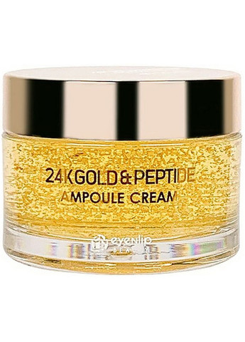 Опис Антивіковий ампульний крем із золотом і пептидами - Eyenlip 24K Gold & Peptide Ampoule Cream Фахівці бренду Eyenlip розробили ефективний антивіковий ампульний крем. В його рецепт закладені пептиди і добірні компоненти, які використовувала в косметичних цілях сама Клеопатра – екстракт меду і дорогоцінне золото. Ці інгредієнти доповнені іншими багатофункціональними складовими, дія яких націлена на збереження краси та молодості шкіри. Особливості Eyenlip 24K Gold & Peptide Ampoule Cream:- легкий і гелевий;- швидко всмоктавшись, не залишає липкого шару;- відновлює і підтримує оптимальний рівень вологи;- дарує відчуття свіжості;- сприяє освітленню тону обличчя;- насичує епідерміс живильними речовинами;- завдяки частинкам золота має захисну дію;- містить комплекс функціональних компонентів і спеціальних пептидів, що активують регенерувальні процеси і розгладження зморшок;- завдяки флавоноїдам, які додані до складу екстракту меду, має антиоксидантні властивості;- надає обличчю сяйва;- може використовуватися як база під макіяж з шиммерним фінішем. Спосіб застосування Уранці і ввечері наносити необхідну кількість крему на шкіру обличчя і шиї після очищення, тонера, сироватки та емульсії. Склад Water, Glycerin, 1,2-Hexanediol, Niacinamide, Dipropylene Glycol, Hydroxyethyl Urea, Polysorbate 80, Glycosyl Trehalose, Carbomer, Arginine, Hydrogenated Starch Hydrolysate, Betaine, Sodium Hyaluronate, Sodium Polyacrylate, Ethylhexylglycerin, Adenosine, Disodium EDTA, Allantoin, Gold, Tocopheryl Acetate, Butylene Glycol, Polysorbate 20, Honey Extract, Palmitoyl Tripeptide-5, Acetyl Hexapeptide-8, Copper Tripeptide-1, Palmitoyl Tripeptide-1, Palmitoyl Tetrapeptide-7, Palmitoyl Dipeptide-7, Palmitoyl Hexapeptide-12, Palmitoyl Pentapeptide-4, Phenoxyethanol, CI 15985, CI 19140, Fragrance