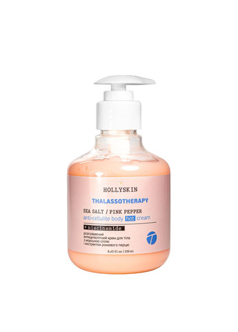 Розігрівальний антицелюлітний крем для тіла Hollyskin Thalassotherapy з рожевим перцем Антицелюлітний крем для тіла з рожевим перцем сприяє припливу крові до проблемних ділянок тіла, вирівнює шкіру, зменшує видимі прояви целюліту. Глибоко зволожує шкіру, зберігає її пружність і пружність у процесі схуднення. Екстракт рожевого перцю ефективно діє на підшкірні жирові накопичення, руйнує їх оболонки, активізує процес розщеплення та виведення жиру та токсинів, запобігає повторному формуванню великих крапель жиру. Спосіб застосування: нанести засіб на чисті проблемні області тіла масажними рухами. Використовувати 2-3 рази на тиждень, як після обгортання та масажу, так і самостійно. Об'єм: 250 мл.
