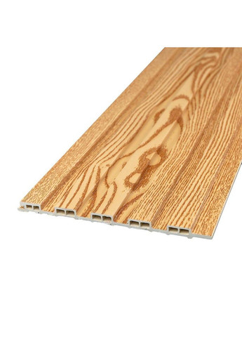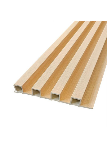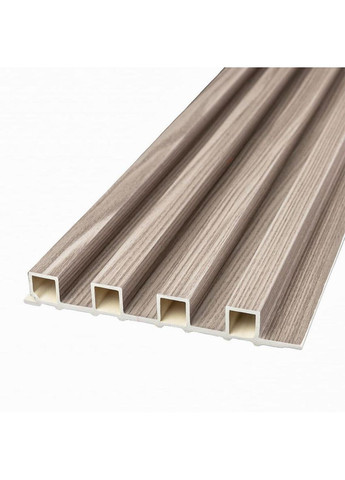 Стінові рейки WPC Опис: Стінові рейки WPC – будівельний матеріал для внутрішнього оздоблення, що імітує натуральну деревину. Фактура: гладка, імітація дерев'яної рейки Рейки складаються з наступних шарів: Полімерний шар, що захищає від потертостей та дрібних механічних пошкоджень, забезпечує довговічність використання, а УФ захист допомагає запобігти вигоранню, зберігаючи колір декоративного шару насиченим, за рахунок чого рейка довго має свій первісний естетичний вигляд. Декоративний шар: плівка з кольоровим друком високої роздільної здатності, яка повністю імітує фактуру природних матеріалів, завдяки чіткому та деталізованому зображенню. Основний шар WPC: є композитним матеріалом, який поєднує в собі деревні волокна (або стружку) з полімерними матеріалами, що забезпечує матеріалу міцність, стійкість до вологи і стійкість до впливу зовнішнього середовища. Температурний режим: від -50 º до +80 º С Застосування: внутрішні оздоблювальні роботи: декорування стін у всіх видах житлових приміщень (кухня, вітальня, дитяча або спальня, вхідна група) та комерційних приміщень (офісні приміщення, зони рецепцій, магазини, салони краси або фітнес-центри), декорування меблів, дверей та інших рівних поверхонь. Властивості та переваги матеріалу: Стійкість до вологи: матеріал WPC має високу стійкість до впливу вологи, не набухає і не деформується. Стійкість до гниття та комах: на відміну від деревини, WPC не схильний до гниття і не приваблює комах. Стійкість до впливу ультрафіолету: стінові панелі WPC зберігають свій колір та структуру під впливом ультрафіолетового випромінювання. Привабливий зовнішній вигляд: декоративний шар імітує натуральне дерево, що дозволяє створювати стильні та естетичні інтер'єри, знижуючи при цьому використання чистої деревини. Простота обслуговування: стінові панелі WPC зазвичай не потребують складного догляду. Вони не вимагають фарбування, обробки антисептиками та формальдегідами, зберігають свій зовнішній вигляд протягом тривалого часу. Розрахунок потрібної кількості матеріалу: Виміряйте довжину і висоту поверхні, що обклеюється. Помножте довжину на висоту кожної поверхні в метрах і складіть отримані результати, щоб отримати площу. Наприклад, після вимірів ви отримали:Довжина стіни 3,2м.Висота стіни 2,7м.3,2 * 2,7 = 8,64 м ² Площа, що вийшла, необхідно розділити на площу однієї рейки (165*3000= 0,456 м²) і округлити у більшу сторону: 8,64 / 0,456 = 18,95 округляємо до 19.У процесі монтажу можуть виникнути відходи, пов'язані з різанням рейок, тому рекомендується додати до розрахунку запасні 1-2 шт. Інструкція з монтажу: Підготуйте поверхню, на яку кріпляться рейки. Їх можна встановлювати на оштукатурені стіни, гіпсокартонні плити та дерев'яні матеріали. Якщо стіна обклеєна шпалерами, рекомендуємо їх зняти. Для різання рейки використовуйте циркулярну пилку або лобзик. Прикріпити рейку до потрібної поверхні можна за допомогою монтажного клею, бажано на поліуретановій або силіконовій основі. Користуючись інструкцією нанести клей на задню частину рейки, після чого встановити на потрібну поверхню. Рейки можна збирати вертикально чи горизонтально. Крім монтажного клею можна використовувати будівельний степлер, щоб закріпити їх на стіні. Прикріплювати скоби необхідно до краю паза рейки, щоб вони не були видно. Необхідні для монтажу матеріали: 