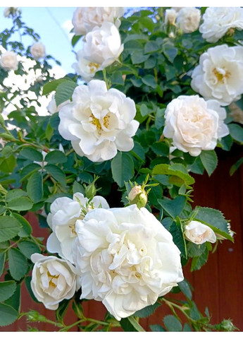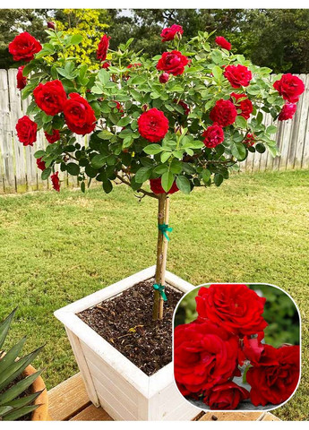 Троянда на штамбі Вейченблау — сорт, відомий своїми дрібними, напівмахровими квітками насиченого фіолетово-пурпурного кольору, які з часом можуть змінюватися на лілові або синьо-сірі відтінки. Квіти зібрані в пишні суцвіття та мають легкий аромат. Цвітіння триває протягом кількох тижнів наприкінці весни або на початку літа. Цей сорт вирізняється тим, що майже не має шипів, що полегшує догляд за ним і робить його зручним для декоративного вирощування на опорах або арках. Переваги троянди на штамбі Вейченблау: Вишуканий фіолетово-пурпурний колір квітів; Цвітіння відбувається масово в суцвіттях; Легкий і приємний аромат; Майже відсутні шипи; Чудово підходить для вирощування на арках і шпалерах; Стійкість до несприятливих умов, включаючи слабке затінення; Витривалий сорт, що добре переносить посуху; Приваблює метеликів завдяки своїм ароматним квітам; Потребує мінімального догляду; Декоративний вигляд навіть після завершення цвітіння. Селекція троянди на штамбі Вейченблау Сорт був виведений у Німеччині селекціонером Германом Кізе в 1909 році з метою створення декоративної фіолетової троянди з невеликими квітками. Основна інформація про сорт троянди на штамбі Вейченблау Основна особливість троянди на штамбі Вейченблау: її унікальний колір, що змінюється від фіолетового до лілово-сірого. Висота дорослого куща троянди на штамбі Вейченблау: до 1,5 м. Форма куща троянди на штамбі Вейченблау: розлогий, із довгими, майже безшипними пагонами, що легко переплітаються на опорах. Місце посадки саджанців троянди на штамбі Вейченблау: найкраще росте на сонячних або злегка затінених ділянках, захищених від сильних вітрів, з добре дренованим, родючим ґрунтом. Схема посадки саджанців троянди на штамбі Вейченблау: 1х1,5 м, 1,2х2 м. Розмір посадкової ями для саджанців троянди на штамбі Вейченблау: повинен бути достатнім для розміщення кореневої системи рослин — 60х60х60 см. Початок цвітіння після посадки троянди на штамбі Вейченблау: на 2 рік. Запилення троянди на штамбі Вейченблау: не потребує додаткових запилювачів. Період цвітіння троянди на штамбі Вейченблау: у період з травня по червень. Квіти троянди на штамбі Вейченблау: невеликі, напівмахрові, зібрані в суцвіття, до 3 см, фіолетово-пурпурні, з часом змінюються на лілові, з білими вкрапленнями та жовтими тичинками. Морозостійкість троянди на штамбі Вейченблау: стійка до помірних морозів, але вимагає укриття в суворі зими. Посухостійкість троянди на штамбі Вейченблау: добре переносить посуху завдяки глибокій кореневій системі. Імунітет до хвороб троянди на штамбі Вейченблау: сорт має природну стійкість до більшості поширених хвороб, що полегшує догляд. Рекомендації при посадці саджанців троянди на штамбі Вейченблау Оберіть сонячне місце, яке отримує щонайменше 6-8 годин прямого світла на день і захищене від сильних вітрів; Забезпечте добре дренований, родючий ґрунт; Викопайте яму розміром 60x60x60 см, щоб коренева система троянди мала достатньо простору для розвитку; На дно ями покладіть дренажний шар з гравію або битої цегли, потім додайте компост або перегній для покращення родючості ґрунту; Установіть саджанець так, щоб коренева шийка була на рівні ґрунту, засипте коріння підготовленою ґрунтовою сумішшю, обережно ущільнюючи землю навколо кореневої системи; Після посадки ретельно полий