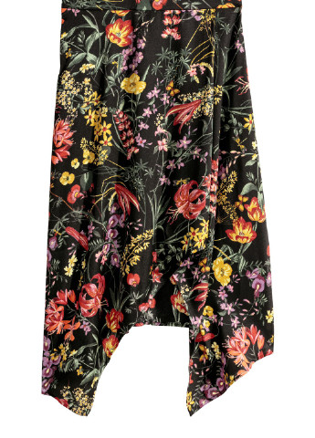 Виміри по виробу: 38 Обхват талії - 72 см Коротка спідниця з віскозного крепу з малюнком, із запахом спереду, гумкою ззаду на талії, таємною блискавкою з одного боку та асиметричним подолом. Без підкладки. Можливе пошкодження бірки