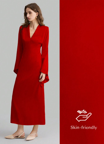 Жіноча атласна сукня максі Ontre – кардинально червона. Це елегантна сукня максі з V-подібним вирізом та довгими розкльошеними рукавами. Прямий поділ та висока талія. Сукня виготовлена зі 100% поліестерового атласу. Підкладка повністю зберігає тепло. Застібається на блискавку. Сукня підходить для урочистих випадків, наприклад, весіль.