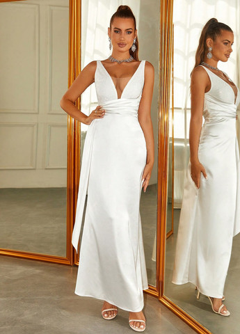 Елегантна атласна сукня SHEIN з високою талією. Сукня з V-подібним вирізом та довгими рукавами. Розкльошений поділ та висока талія. Без підкладки. Застібається на блискавку. Сукня підходить для урочистих заходів, таких як весілля. Рекомендується прати у пральній машині.