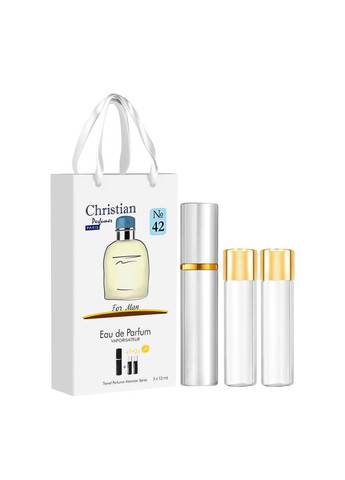 Набір чоловічих парфумів Christian № 37 з атомайзером та двома запасками 3 х 12 мл Чоловіча парфумована вода №37 від бренду Christian поєднує мускусні, дерев'яні та квіткові ноти. У початкових нотах композиції лимон, мандарин, ромашка, білий кедр, бергамот, глід, лаванда та квіти мускатного горіха створюють оригінальний букет. Серцеві ноти цього неповторного парфуму для чоловіків - ефіри листя фіалки, білого кедра, гвоздики, жасмину, жимолості, конвалії, мускатного горіха та сандалу, які утворюють віртуозний ароматичний ансамбль. Завершальні ноти ветивера, шкіри, мускусу, пачулі, амбри та бобів тонка залишають глибокий і чуттєвий шлейф, занурюючи у вишуканий світ чоловічої елегантності. Тип аромату: квіткові, мускусні, деревні. Початкова нота: лимон, мандарин, ромашка, білий кедр, бергамот, глоду, лаванда, квіти мускатного горіха. Нота серця: листя фіалки, білий кедр, гвоздика, жасмин, жимолость, конвалія, мускатний горіх, сандал. Кінцева нота: ветивер, шкіра, мускус, пачулі, амбра, боби тонка. Парфумований набір представлений у зручному форматі — атомайзер та дві запаски. Тому ви завжди зможете мати улюблений аромат під рукою. Об'єм: 3 х 12 мл