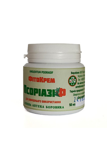 Фітокрем "ПсоріазіФ" — UNGUENTUM PSORIASIF — це ефективний натуральний засіб для зовнішнього застосування при псоріазі, парапсоріазі, атопічному дерматиті, червоному плоскому лишаї та інших хронічних дерматозах. Створений за авторською рецептурою Зеленої аптеки БОРОВИКА™, крем розроблений спеціально для щоденного використання на уражених ділянках шкіри без ризику гормонального або токсичного навантаження на організм. Склад фітокрему: жировий солідол продукти бджільництва рослинна сировина і їх олійні екстракти мінеральні речовини. Не містить гормонів, антибіотиків, токсинів! 🌿 Властивості фітокрему "ПсоріазіФ": сприяє поступовому очищенню шкіри від псоріатичних бляшок та почервонінь; зменшує свербіж, подразнення і запалення; блокує утворення нових бляшок (пригнічує проліферацію кератиноцитів); нормалізує мікроциркуляцію і клітинне дихання шкіри; стимулює регенерацію епідермісу; має антисептичну, антибактеріальну, заспокійливу дію. Фітокрем наносити рівномірним тонким шаром 1 раз на день. Не змивати протягом 10-12 годин. 🧴 Спосіб застосування: Наносити тонким рівномірним шаром 1 раз на добу, не змивати протягом 10–12 годин. Рекомендовано наносити увечері, перед сном, а вранці змити залишки крему за допомогою фітогігієнічних засобів: та/або . 🕒 Курс застосування: До повного відновлення шкірного покриву (зникнення бляшок і покраснінь). Застосовується як основний зовнішній засіб у комплексній програмі фітотерапії псоріазу. ⚠️ Протипоказання: Індивідуальна чутливість до компонентів засобу. 🧪 Термін придатності: 6 місяців Дата виготовлення зазначена на упаковці.