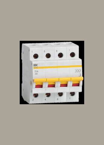 Вимикач навантаження ВН-32 4Р 25А UEC, MNV10-4-025Служать для включення, проведення та відключення номінального струму в нормальних умовах експлуатації, проведення струму в аварійних режимах, наприклад, при короткому замиканні, а також для виконання функцій роз'єднання. Удосконалена ширша рукоятка включення вимикача зі збільшеною площею контакту. Широкий діапазон робочих температур від -40°С до +50°С. Насічки на контактних затискачах знижують теплові втрати та збільшують механічну стійкість з'єднання. Швидкий монтаж за допомогою клямки з подвійним фіксованим положенням. /> Тип напруги Змінний (AC) Тип увімкнення або вимкнення Вимикач-роз'єднувач навантаження Із сигнальною лампою - індикатором Ні Номін струм 25 А Номін раб напруга 400 В Кількість перемикаючих контактів 0 Робоче положення Вертикальне Кількість полюсів 4 Частота мережі 50 Гц Тип лампи Не застосовується Номін відключаюча здатність - кА Номін імпульсна напруга, що витримується 6 кВ Ширина за кількістю модульних відстаней 4 Колір Сірий Категорія застосування AC-22 А Макс поперечний переріз провідника 35 мм² Силове роз'єднання - згідно з DIN VDE 0113 Ні Ступінь захисту - IP IP20 Кількість нормально замкнутих - НЗ контактів 0 Кількість норм розімкнених - НО контактів 4 Кількість перемикаючих контактів 0 Група механічного виконання M1 Електро зносостійкість 20000 циклів Механічна зносостійкість 30000 циклів Діапазон робочих температур -40...50 °C Вкл и откл способность 3 I на Ie Відносна вологість повітря 50% при 40°С Кут можливого відхилення у робочому положенні 90 ° Приєднувальна здатність контактних затискачів 4…35 мм²