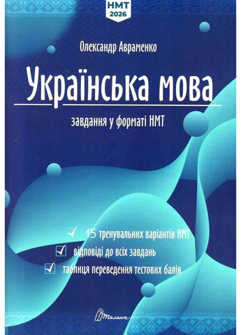 Авраменко НМТ 2026 Українська мова Тестові завдання 16 варіантів у форматі НМТ Талант Посібник українського мовознавця О. Авраменка допоможе абітурієнтам легко підготуватися до тестової частини з української мови. У збірці ви знайдете 15 тренувальних варіантів НМТ і відповіді до всіх завдань, а також таблицю переведення тестових балів з української мови. Зміст завдань відповідає програмі ЗНО, що охоплює всі мовні теми, передбачені вивченням у шкільному курсі української мови, а саме: • фонетика, графіка, орфоепія, орфографія; • лексикологія, фразеологія; • будова слова, словотвір; • морфологія; • синтаксис, пунктуація; • стилістика; • розвиток мовлення.