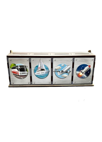 4 тематичні скриньки з різними видами транспорту: водний, сухопутний, повітряний та космічний. У наборі йде 40 плашок із реалістичними малюнками для сортування та 4 картки для гри в лото. Дитині потрібно розкласти весь транспорт асоціаціями: автобус - це наземний вид транспорту, а корабель - водний і т. д. Другий варіант гри: викладайте по 3 плашки з тематикою, наприклад, повітряного транспорту, а 4 з поїздом і просіть дитину знайти зайву плашку в цьому ланцюжку. Розгляньте всі фішки разом із дитиною. Назвіть транспорт, який зображений на фішках. Запропонуйте дитині сховати всі фішки в будиночки, опускаючи в отвори коробки-сортера. Гра "Лото для малюків". Візьміть одну картку та підберіть заздалегідь для неї фішки. Розгляньте та назвіть разом із дитиною всі зображення на фішках та на картках. Ви можете урізноманітнити гру, сховавши фішки в мішечок. Попросіть дитину витягувати з мішечка по одній фішці і знаходити таку ж картинку (будиночок фішки) на картці. Ще один варіант гри для малюків: викладаєте по 3 плашки з тематикою, наприклад, водний транспорт, а 4 з літаком і просіть дитину знайти зайву плашку в цьому ланцюжку. Гра "Лото". Розгляньте та назвіть зображення на картках. Фішки розкладіть на столі зображення вниз. Картки розподіліть між гравцями (можна вибрати). Вибирається ведучий, який відкриватиме по одній фішці і називатиме зображену на ній картину. Гра "Дві руки". Викладіть перед дитиною фішки із зображеннями, які стосуються лише двох видів транспорту. Попросіть дитину збирати та кидати фішки в коробку-сортер двома руками (правою рукою можна збирати тільки водний, а лівою – тільки наземний). Старшим дітям можна запропонувати варіант гри на час. Вікторина. Поповнюйте знання дитини цікавими фактами про різні види транспорту. Запропонуйте йому зіграти у вікторину, в якій ви ставитимете запитання, а дитина - давати на них відповіді.