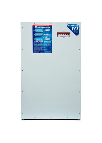 Стабілізатор трифазний напруги складається з трьох незалежних стабілізаторів НСН зібраних і комутованих в одному корпусі. Конструктивно стабілізатор виконаний у металевому корпусі, що дозволяє експлуатувати його в варіанті підлоги. На лицьовій панелі розташовані РК індикатори, що показують (за замовчуванням) рівень вхідної та вихідної напруги, струм та номер ступеня. Моделі серії INFINITY 3X розраховані на стабілізацію вхідної лінійної напруги в інтервалі 200-500 В та підтримують 4.5% точність вихідних параметрів. Компактні пристрої встановлюються на горизонтальній поверхні або кріпляться на стіні за допомогою спеціального кронштейна. Характеристики: Потужність: 60кВА Точність стабілізації вихідної напруги: ±%4.5 Число ступенів автоматичного регулювання: 16 Робочий діапазон вхідної лінійної напруги: 200÷495 В Робочий діапазон вихідних лінійних напруг: 365÷397 В Граничний діапазон вхідної лінійної напруги: 105÷520 В Час реакції на аварійну зміну напруги: до 20 мс Температура теплового захисту: 105°C Розміри: 310×640×1050 Вага: 125 кг Переваги цієї серії: • точність, швидкодія; • широкий діапазон вхідної напруги; • міцна компактна конструкція; • тривалий термін служби; • безперервність контролю вхідних параметрів струму; • ефективне повітряне охолодження робочих вузлів; • можливість підстроювання інтервалу вхідної напруги; • надійний захист від перевантаження, перегріву та короткого замикання. Стабілізатор забезпечує: • стабілізацію вихідної фазної напруги на рівні 220 В, частотою 50 Гц; • автоматичне відключення від мережі при підвищенні вхідної фазної напруги вище верхньої граничної вхідної напруги; • неспотворену форму синусоїдальної вихідної напруги; • роботу у всьому діапазоні навантажень від холостого ходу до максимального навантаження; • захист від короткого замикання та тривалого перевантаження на виході; • режим "транзит" у аварійній ситуації; • захист споживачів від перенапруги в режимі транзит при 265 В (при 445 В лінійному); • тепловий захист автотрансформатора; • відключення споживачів при короткочасному зникненні мережі живлення (виключає пошкодження імпульсних джерел живлення споживачів); • відображення вхідної фазної напруги;