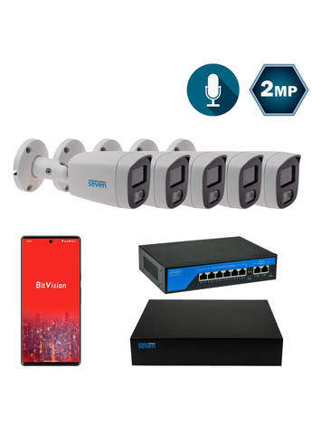 Застосування комплекту відеонагляду SEVEN IP-7222W5-2MP Комплект зовнішнього спостереження SEVEN IP-7222W5-2MP є універсальним і може бути застосований для найрізноманітніших завдань відеоспостереження. За допомогою готового комплекту відеоспостереження можна значно підвищити безпеку як житлових приміщень, так і комерційних або промислових об'єктів. Камери, що входить до складу комплекту є всепогодною і може бути встановлена як на вулиці, так і всередині приміщення. Камера здатна працювати як повністю автономний пристрій записуючи відео зі звуком на SD карту, а також у складі класичної системи відеоспостереження з відеореєстратором. Найчастіше набір на 5 IP-камер відеоспостереження використовують: У під'їзді або на поверсі багатоквартирного будинку, над входом в квартиру. На вході в парадне багатоквартирного будинку. У дворі на ділянці або всередині приватного будинку, на дачі. У різних типах невеликих офісів. У невеликих магазинах для спостереження за торговельною залою. У кафе чи кіосках. На парковці для спостереження за машиною або гаражі. На СТО або мийці. На виробництві в цеху, будівництві для нагляду за конкретним об'єктом. Комплект SEVEN IP-7222W5-2MP готовий для самостійної установки, так як включає в себе всі необхідні компоненти для створення повноцінної системи відеоспостереження. До готового комплекту системи відеоспостереження SEVEN IP-7222W5-2MP входить Відеокамера SEVEN IP-7222PA white - 5 шт. IP-відеореєстратор SEVEN IR-7209-AI Lite - 1 шт. PoE комутатор 6 портів SEVEN P-7326 – 1 шт. Наклейка "Ведеться відеоспостереження" - 1 шт. IP-відеореєстратор SEVEN IR-7209-AI Lite Серцем комплекту відеоспостереження є відеореєстратор SEVEN IR-7209-AI Lite, який дозволяє підключати до себе 9 IP-відеокамер до 8 Мп (загальний потік до 72 Mbit/s). Запис: 8MP/5MP/4MP/3MP/2MP - 30к/с. Підтримка жорстких дисків HDD SATA х 1 (до 8ТБ). Onvif 19.12 Profile S/T. Смарт аналітика: ґрунтується на підключеній IP-камері SEVEN Systems. До відеореєстратора можна підключити монітор для перегляду живого відео та архіву записів із камер безпосередньо на ньому. У такому разі керування відеореєстратором відбувається через його інтерфейс за допомогою миші. При підключенні відеореєстратора до мережі інтернет можна керувати ним з будь-якої точки планети за допомогою веб-браузера, програми для комп'ютера iVMS320 або мобільного додатка BitVision. Запис відео з 5 циліндричних 2 Мп IP-камер SEVEN IP-7212PA white на жорсткий диск Відеореєстратор для зберігання записів використовує жорсткий диск із ємністю до 8 ТБ. Залежно від обсягу встановленого накопичувача, глибина архіву може змінюватися. Запис по детекції руху, як правило, займає вдвічі менше за дисковий простір. Зберегти записи архіву з відеореєстратора можна за допомогою: Веб-інтерфейс відеореєстратора, використовуючи інтернет браузер. Програми для комп'ютера iVMS320. Мобільний додаток BitVision. Безпосередньо з інтерфейсу відеореєстратора на флешку USB. Особливості циліндричної IP-камери спостереження SEVEN IP-7222PA white SEVEN IP-7222PA white - це циліндрична 2-х мегапіксельна IP-відеокамера з вбудованим мікрофоном, слотом під SD-карту і адаптивним інфрачервоним підсвічуванням. Камера виконана в повністю металевому антивандальному корпусі білого кольору і захищена від вологи за стандартом IP67. Відеокамеру можна встановлювати на вулиці або всередині приміщення. Установка і підключення камери безпеки до комп'ютера, відеореєстратора, роутера, світчу про
