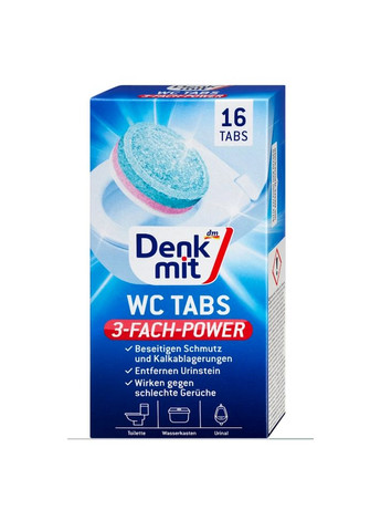 Таблетки для чищення бачка унітаза DenkMit WC-Tabs, 16 шт (Німеччина) DenkMit WC-Tabs — ефективні таблетки для підтримки чистоти та свіжості унітазу. Завдяки спеціальній формулі вони запобігають утворенню нальоту, каменю та неприємного запаху, одночасно підтримуючи свіжість води у бачку після кожного змиву. Просте використання: вийміть таблетку з пакування та помістіть її у бачок унітазу — вона поступово розчиняється, забезпечуючи тривалий ефект чистоти та гігієни. Підходить для щоденного догляду за будь-яким типом унітазу. Переваги DenkMit WC-Tabs: 16 таблеток у пакуванні; ефективне запобігання нальоту та каменю; підтримка свіжості та приємного аромату; легке та зручне використання — витягайте з пакування та одразу кладьте у бачок; німецька якість і тривалий ефект. DenkMit WC-Tabs — просте та надійне рішення для щоденного догляду за унітазом та підтримки гігієни у вашому домі.