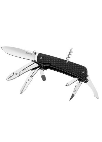 Опис ножа Ruike Trekker LD51: Ніж виготовляється з високоякісних матеріалів, а тому вийшов неймовірно довговічним. Серед додаткових функцій користувач знайде такі: пасатижі, ножиці, два види кусачок, дротяний загин, хрестова викрутка, 3 викрутки з прямим шліцом, штопор, невелику пилу по дереву, шило, гайковий ключ, відкривачку, склобій, відокремлюваний повноцінний пінцет. Розміщені інструменти дуже зручно і надійно – немає ніяких люфтів і працювати кожним з них комфортно. Сталь 12С27 використовується для виробництва всіх інструментів і основного клинка в даному ножі. Цей метал стійкий до корозії, міцний і твердий. Можна без побоювання працювати в умовах високої вологості – іржа точно не з'явиться. Показник твердості – 59HRC, а тому ріжуча кромка довгий час залишається гострою. У відкритому стані клинок утримується замком Liner Lock. Накладки на рукоятці зроблені з композиту G10. Це склотекстоліт, який відрізняється неймовірно високою міцністю і повної несприйнятливістю до корозії. При температурі від -50 до +140 °C даний матеріал не змінює своїх властивостей, а тому ножа можна використовувати в будь-якій ситуації. А текстурована поверхня дозволяє забезпечити максимально надійний хват. Притискна кліпса, що розміщується збоку рукоятки, що дозволяє безпечно і зручно переносити ніж. Особливості: 23 інструменту в наборі; довжина основного клинка становить 85 мм.; повний розмір Ruike LD51 – 199 мм; маса складає 262 грама; ручка виготовлена з композиту G10; всі металеві частини зроблені із сталі 12С27; лезо у відкритому вигляді утримується замком Liner Lock. Гарантія: На ніж Ruike LD51 надається п'ять років гарантії. Інструменти: Довге лезо з одноруким відкриттям Плоскогубці Кусачки для дроту Плоскогубці для волосіні Ножиці Інструмент для закручування дроту Відкривачка для пляшок Велика викрутка 6,5 мм Інструмент для оголення дроти Пила по дереву Скальпель Шило Інструмент для роботи з проводом Ключ для велосипедних спиць Отвір для протягування нитки Викрутка Philips Стропоріз Мала викрутка 3 мм Кишенькова кліпса Штопор Склобій Кільце для ключів/ темляка Пінцет Інформація: Трикутник позначає рік, а цифри місяць, коли цей ніж був проведений