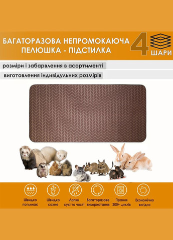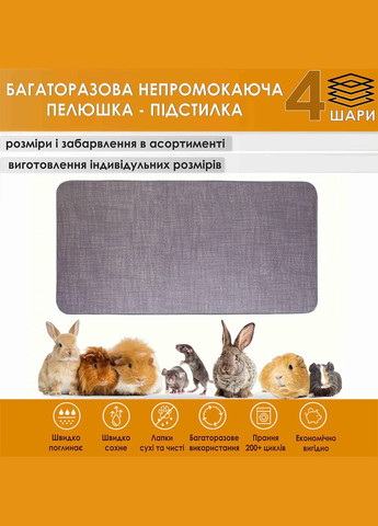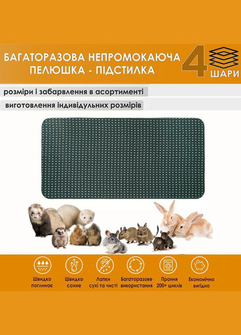 Багаторазова пелюшка-підстилка 4 шари для дрібних тварин Ідеальне рішення для комфорту та гігієни ваших маленьких улюбленців! Підходять для тварин: • Собаки • Морськи свинки • Щури • Тхори • Декоративні кролики • Їжачкі • Білки дегу • Шиншили Наша багаторазова пелюшка-підстилка забезпечує чудову поглинаючу здатність, м'якість та захист від протікань, створюючи затишне та чисте середовище для ваших улюбленців. Завдяки своїй багатошаровій структурі, ця підстилка значно перевершує одноразові аналоги, забезпечуючи економічність та екологічність. Основні переваги: * 4 шари високоефективного захисту: * Верхній шар: М'яка бавовна. Гіпоалергенна та приємна на дотик. * Перший поглинаючий шар: Високоабсорбуюча тканина, яка миттєво вбирає рідину, запобігаючи її розтіканню. * Другий поглинаючий шар: Додатковий шар для максимального поглинання та утримання вологи * Нижній водонепроникний шар: Міцна та непромокальна мембрана, яка надійно захищає підлогу клітки від протікань та забруднень. * Економічність та екологічність: Забудьте про постійну потребу в одноразових пелюшках і тирсі! Наша багаторазова підстилка витримує численні прання, заощаджуючи ваші кошти та зменшуючи кількість відходів. * Здоров'я та комфорт тварини: Суха поверхня запобігає подразненню шкіри та розвитку бактерій, підтримуючи гігієну вашого улюбленця. М'який бавовняний верхній шар створює затишне місце для відпочинку. * Універсальність використання: Ідеально підходить для використання в клітках, переносках, манежах, вол’єрах а також як підстилка під миски з їжею та водою. * Легкість у догляді: Пелюшку легко прати в пральній машині при низьких температурах. Швидко сохне. * Різноманітність розмірів та кольорів: Виберіть оптимальний розмір, який ідеально підійде для клітки вашої тварини, а також колір, який гармонійно впишеться в інтер'єр. Якщо Ви не знайшли потрібного розміру, маєте змогу замовити виготовлення підстилки за Вашими розмірами Рекомендації щодо використання та догляду: * Регулярно перевіряйте стан пелюшки та за необхідності замінюйте її на чисту. * Прання рекомендується при температурі не вище 30°C. * Не використовуйте відбілювачі та агресивні миючі засоби. * Віджим до 700 обертів * Сушити при низькій температурі або на повітрі. * Не прасувати. Витримує понад 200 циклів прання Подбайте про чистоту та комфорт вашого маленького друга з нашою надійною багаторазовою пелюшкою-підстилкою!