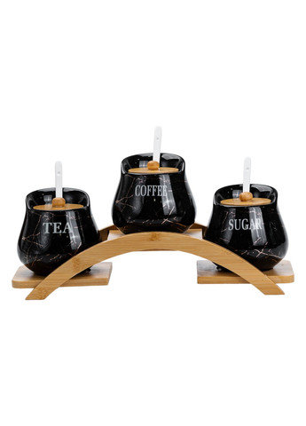 Набір для сипучих продуктів складається з трьох баночок об'ємом по 500 мл кожна. Баночки чорного кольору з золотистими прожилками, що імітують мармур, надають елегантного та розкішного вигляду. Кожна баночка має бамбукову кришку зі зручною ручкою, що забезпечує надійне зберігання продуктів та легкість у використанні. На кожній баночці нанесено напис: SUGAR, COFFEE та TEA, що допомагає швидко знайти потрібний продукт. Комплектується бамбуковою підставкою, яка додає зручності у зберіганні та організації на кухонному столі. До кожної банки додається ложечка, що робить набір ще більш практичним і функціональним. Цей набір не лише забезпечує зручне зберігання сипучих продуктів, але й додає вашій кухні стильний та сучасний вигляд. Характеристики: Матеріал банок: Кераміка Матеріал підставки: Бамбук Висота банок: 20.5 см Об'єм банок: 500 мл