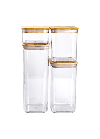 Кожна з чотирьох ємностей має квадратну форму та відрізняється оптимальним об'ємом для організації зберігання сипких продуктів. Банки виготовлені із харчового прозорого пластику, що дозволяє контролювати кількість інгредієнтів та вчасно поповнювати запаси. Бамбукові кришки надійно закривають ємності, підтримуючи свіжість та зберігаючи якість продуктів. Цей набір банок допоможе ефективно організувати простір на кухні. Розміри банок: Банка об'ємом 3,7 літра Банка об'ємом 2,7 літра Банка об'ємом 1,7 літра Банка об'ємом 0,7 літра