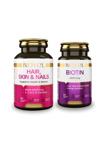Бренд NOVEL – це Швейцарські вітаміни, контроль якості та технології виробництва здійснюється протягом усього циклу найкращими швейцарськими фахівцями. Вітаміни NOVEL мають оптимально збалансовані інгредієнти, високі стандарти безпеки, максимальну ефективність та швидку дію. NOVEL – смачні жувальні вітаміни для здоров'я, без цукру, без алергенів, без ГМО, лише натуральні барвники. Набір вітамінів NOVEL включає 2 ефективні дієтичні добавки у формі жувальних таблеток з приємним фруктовим смаком: Біотин 5000 мкг + Hair, Skin & Nails. 1. NOVEL БІОТИН 5000 мкг (60 капсул) подарує волоссю силу і блиск, покращує структуру та зовнішній вигляд, а також буде сприяти здоровому зростанню нігтів. Біотин допомагає знизити ламкість нігтьової пластини, сприяє зміцненню та зволоженню шкіри. Біотин є незамінним інгредієнтом для ефективної обробки вуглеводів, жирів і білків, що забезпечує енергію і життєву силу. Відчуй приплив енергії, який допоможе тобі залишатися активною та бадьорою протягом усього дня. Біотин допоможе знизити рівень шкідливого холестерину, підтримає серцево-судинну систему, допоможе покращити пам'ять та когнітивні функції. Рекомендований спосіб застосування та дозування Дорослим та дітям від 12 років: по 1-2 жувальні таблетки на добу. 1 жувальна таблетка містить: біотин 5000 мкг, 10000%. 2. NOVEL Hair, Skin & Nails (60 капсул) - це унікальна формула добавки, що працює зсередини та допомагає підтримувати природну красу. Вітаміни С, Е та А допомагають зберегти молодість шкіри та ефективно захищають її від шкідливих вільних радикалів. Пантотенова кислота та Вітамін В6 сприяють зміцненню волосся та зменшують його втрату. Біотин покращує структуру волосся і зменшує його ламкість, а також сприяє зміцненню нігтів. Цинк підтримує здоров'я шкіри, волосся та нігтів, сприяючи їх росту та зміцненню. Фолієва кислота, Йод, Холін та Інозитол насичують клітинну структуру шкіри, волосся та нігтів, допомагаючи їм залишатися здоровими та блискучими. Вітаміни D3 та В12 покращують загальний вигляд шкіри, крім того зміцнюють волосся та нігті. Рекомендований спосіб застосування NOVEL Hair, Skin & Nails, дозування: Дорослим та дітям від 12 років: по 1-2 жувальні таблетки на добу. 1 жувальна таблетка містить: Вітамін С 10 мг, 13%; Вітамін Е 55 мг, 46%; Пантотенова кислота 26 мг, 43%; Біотин 2500 мкг, 5000%; Цинк 1,35 мг, 14%; Вітамін В6 1 мг, 71%; Вітамін А 315 мкг, 39%; Фолієва кислота 130 мкг, 65%; Йод 21 мкг, 14%; Холін 20 мкг; Інозитол 20 мкг; Вітамін D3 5 мкг, 100%; Вітамін В12 3 мкг, 120% Вітаміни Novel не містять: цукор, алергени, ГМО. Після відкриття зберігайте у сухому, прохолодному, недоступному для дітей місці.