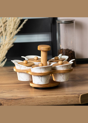 Набір баночок для сипучих продуктів складається з п'яти банок по 120 мл, виконаних у білому кольорі під мармур. Ці елегантні баночки створені для зручного та стильного зберігання різноманітних сипучих продуктів, таких як спеції, цукор, сіль чи чай. Кожна банка оснащена бамбуковою кришкою, яка забезпечує надійне закриття і зберігає продукти свіжими, а також керамічною ложечкою, що додає зручності у використанні та точного дозування. Особливістю цього набору є бамбукова підставка, що обертається, вона забезпечує легкий доступ до будь-якої з баночок. Підставка не лише надає набору стійкості, але й економить простір на кухні, роблячи зберігання організованим і стильним. Використання бамбука додає природного вигляду та екологічності, гармонійно поєднуючись з мармуровим дизайном банок. Цей набір баночок для сипучих продуктів є не тільки практичним, але й декоративним елементом для вашої кухні. Завдяки своєму стильному дизайну та високоякісним матеріалам, він стане чудовим доповненням до будь-якого кухонного інтер'єру, підкреслюючи ваш смак та увагу до деталей. Баночки легко миються та довговічні у використанні, що робить їх ідеальним вибором для кожного дому. Характеристики: Матеріал банок: Кераміка Матеріал підставки: Бамбук Об'єм однієї банки: 120 мл