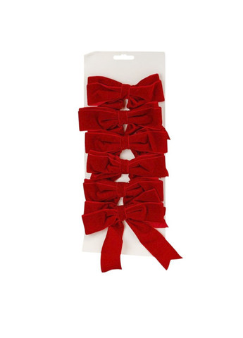 Набір декоративних оксамитових бантів червоного кольору включає шість штук, кожен з яких має оптимальний розмір 16 см, що робить їх чудовим вибором для комплексного та детального оформлення. Банти виготовлені з якісного м'якого оксамиту, що надає їм насичений глибокий червоний колір, який є класичним символом Різдва, та благородну матову текстуру, яка елегантно поглинає світло. Цей комплект є універсальним і функціональним елементом новорічного декору, ідеально підходящим для рівномірного прикрашання середньої ялинки, декорування гірлянд, створюючи ритмічні повтори кольору, а також для оздоблення стільців, оформлення подарунків чи створення святкових акцентів у різних зонах кімнати. Червоний оксамит миттєво додає інтер'єру теплоти, традиційної святковості та витонченої фактурності, допомагаючи створити затишну і класичну різдвяну атмосферу. Країна виробник: Китай.