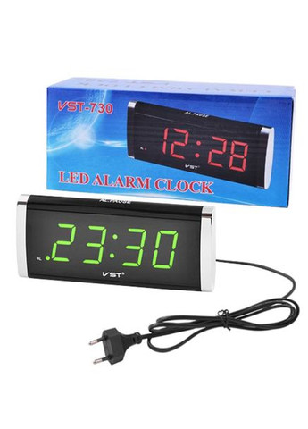 Електронний годинник-будильник VST-730 Настільний годинник — це обов'язковий атрибут інтер'єру. Електронний годинник VST-730-2 — це класична модель у сучасному виготовленні. Рідкокристалічний дисплей показує поточний час у годиннику та хвилинах. Розмір цифр великий, читабельний, їх чудово буде видно як за яскравого сонячного світла, так і темної пори. Годинник прямокутної форми, зі згладженими краями. Корпус виготовлений із високоякісного міцного пластику. Під табло розміщений логотип фірми. Пристрій настільного типу. Спеціальна підставка утримує годинник у вертикальному положенні з невеликим кутом нахилу. Ця модель годинника працює від звичайної мережі з напругою 220V. Але виробником передбачена можливість роботи на батарейці типу Крона 9V. Якщо вам потрібно вимкнути пристрій, наприклад, щоб перенести в інше місце, то параметри не зб'ються завдяки резервному живленню від батарейки. Кнопки вимикання годинника, настроювання часу та сигналу будильника розміщені зі зворотного боку. Відстрочити сигнал, який спрацював, можна натисканням на верхнє ребро корпусу. Зверху є спеціальна позначка. Компактна модель підходить для робочого офісного столу, вітальні або домашнього кабінету. Характеристики: - Бренд VST, - Живлення від мережі 220V, - Розміри 190х60х80 мм. Додаткові Характеристики: - LED-дисплей, будильник (вимкнення натисканням на годинник зверху), м'яке зелене світіння. - Функція пам'яті (запасне живлення від 2 батарейок типу AAA) — призначене для зберігання параметрів після вимкнення електрики. Комплектація: - Годинник, - Упаковка.