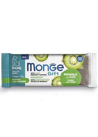 Батончики Monge Gift виготовляються без використання зернових продуктів (глютену), штучних барвників і цукру. Це особливо важливо для тварин, які страждають від харчових алергій і мають особливі потреби в харчуванні. Обрати смаколики для собак і цуценят від італійського бренду Monge Gift — це забезпечити свого улюбленця смачним і здоровим частуванням, що подарує йому радість та стане ще одним способом висловити вашу щиру любов до нього! Чим корисні ласощі для собак у вигляді м'ясних батончиків? М'ясо свинини, як високоякісний білок, необхідний для розвитку м'язів, кісток і шерсті. Вітаміни та мінерали для правильного розвитку та зміцнення імунітету. Жування батончиків допомагає цуценятам чистити зуби та масажувати ясна, що корисно для зубів і гігієни порожнини рота. Можна використовувати як ласощі під час дресування. Батончики — це смачний і ароматний спосіб заохочувати цуценя за хорошу поведінку. Переваги та особливості: виготовлені з натуральних інгредієнтів; без штучних добавок, барвників і консервантів; гіпоалергенний продукт — без глютену; сприяють росту кісток і м'язової маси; підтримують красиву та здорову шерсть; зміцнюють імунітет; корисне і смачне доповнення до раціону. Інгредієнти: В'ялена свинина(35%), картопля, гліцерин, картопляний крохмаль, сушений ківі (1%, що відповідає 8,3% свіжого ківі), дріжджові продукти(1%). Гарантований аналіз: Сирий білок: 25%, сира клітковина: 1,7%, сирий жир: 4,5%, сира зола: 3,5%, волога: 30%. Харчові добавки/кг: Вітамін D3 200 МЕ, вітамін Е(all - rac- альфа-токоферилацетат) 15 мг, біотваней 20 мкг, L- карнітин 100 мг. Метаболізована енергія: 2493 ккал/кг. Рекомендації щодо годування: Для дорослого собаки середнього розміру (10-32 кг) денна порція варіюється від 1 до 3 батончиків на день. Необхідно доповнювати та коригувати раціон, використовуючи повнораціонні корми для домашніх тварин . Важливо вжити відкритий корм протягом 4 тижнів з моменту відкриття пакування, а також підтримувати доступ до свіжої та чистої води. Зверніть увагу, що цей корм призначений виключно для собак і не призначений для вживання в їжу людиною.
