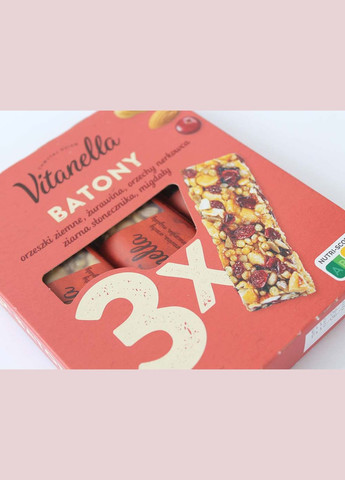 Горіхові батончики Vitanella з журавлиною та медом. В упаковці 3 штуки по 35 грам. Арахісові батончики з мигдалем, горіхами кешью, насінням соняшника та медом. Виготовлені у Чеській Республіці. Батончики Vitanella втамовують голод і довгий час є надійним джерелом енергії. Забезпечують організм енергією і без набору зайвої ваги, на відміну від десертів із цукром, булочок або тістечок в обідню перерву. Скористайтеся батончиками, перебуваючи в автомобільному заторі або офісі, на відпочинку з друзями або на парах, на велопрогулянці чи спортзалі – для поповнення енергії за відсутності можливості повноцінного прийому їжі або між ними скористайся батончиками від Vitanella. Енергетична цінність в 100 г продукту – 1997 кДж / 477 ккал Жири – 25 г (з них насичені жирні кислоти 3,6 г) Вуглеводи – 50 г (з них цукру 33 г) Білки – 11 г Сіль – 0,04 г. Продукт безглютеновий.