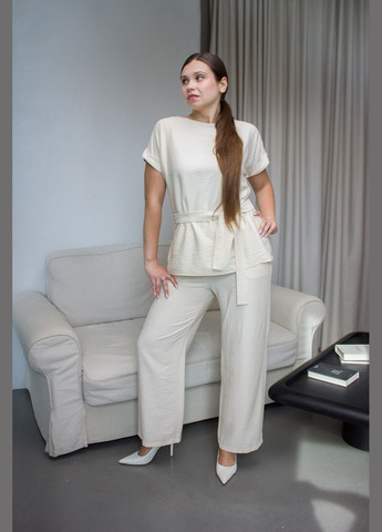Жіночий стильний костюм - двійка блузка та штани у вільному стилі oversizes дозволить виглядати кокетливо та привабливо. Блузка пряма вільний силует, короткий рукав з підворотом, прикрашена вирізами з боків, які додають стиль та зручність. Пояс доповнює образ, наголошуючи на талії. Штани із зручною резинкою на поясі та двома кишенями з боків забезпечують практичність та функціональність. Ніжна текстура тканини надає комфорту та легкості. Добре поєднується з мокасинами, каблуком, босоніжками. Підходить для прогулянок, романтичних зустрічей. Цей костюм - ідеальний вибір для сучасної та стильної жінки, пропонуючи зручність та елегантність у кожній деталі.